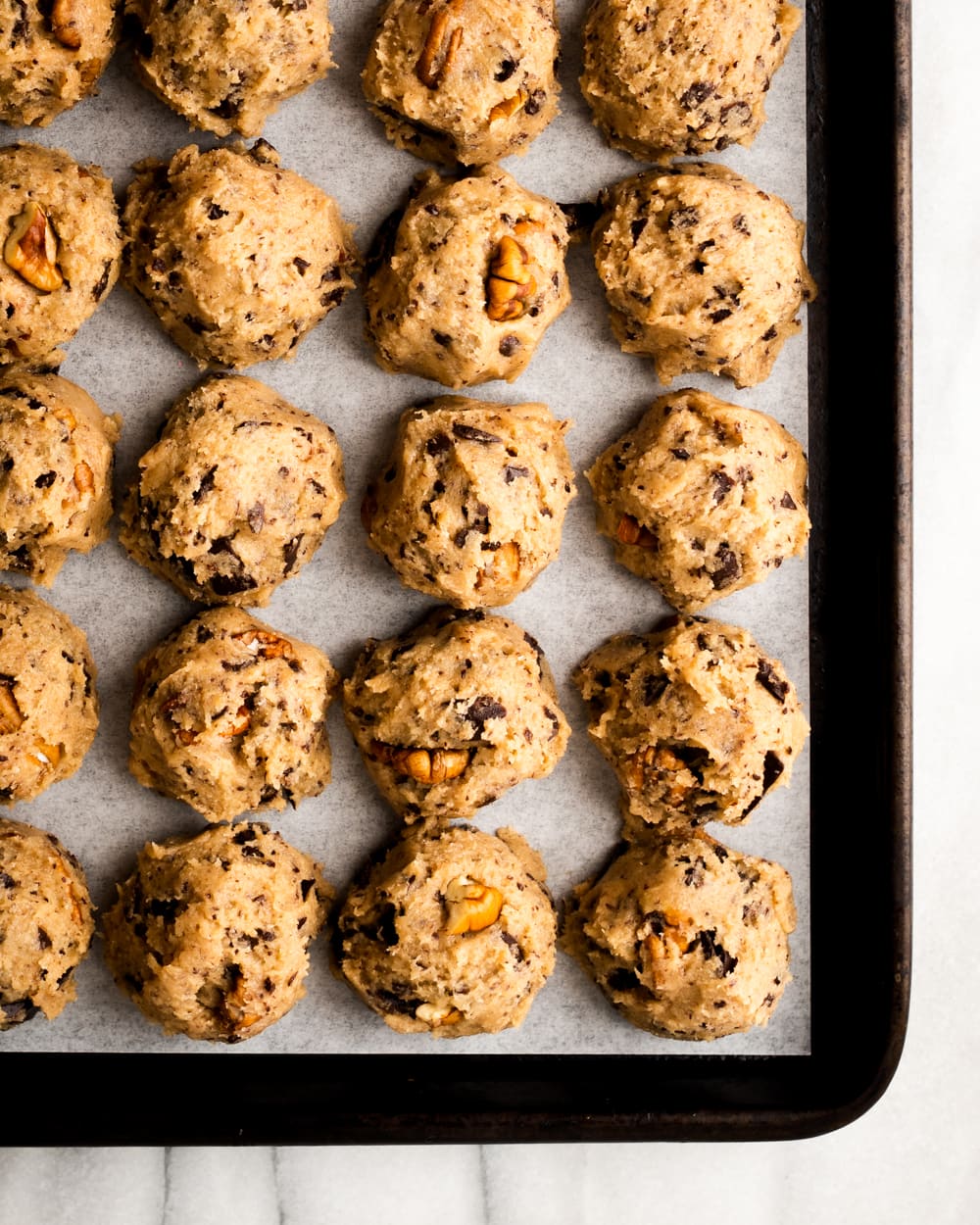 - Using a cookie scoop, form dough into balls (approx. 1.5 tablespoons of dough). Place on a baking sheet and refrigerate the dough balls for, at least, 20 minutes (the longer, the better). You can freeze any leftover dough for future use.