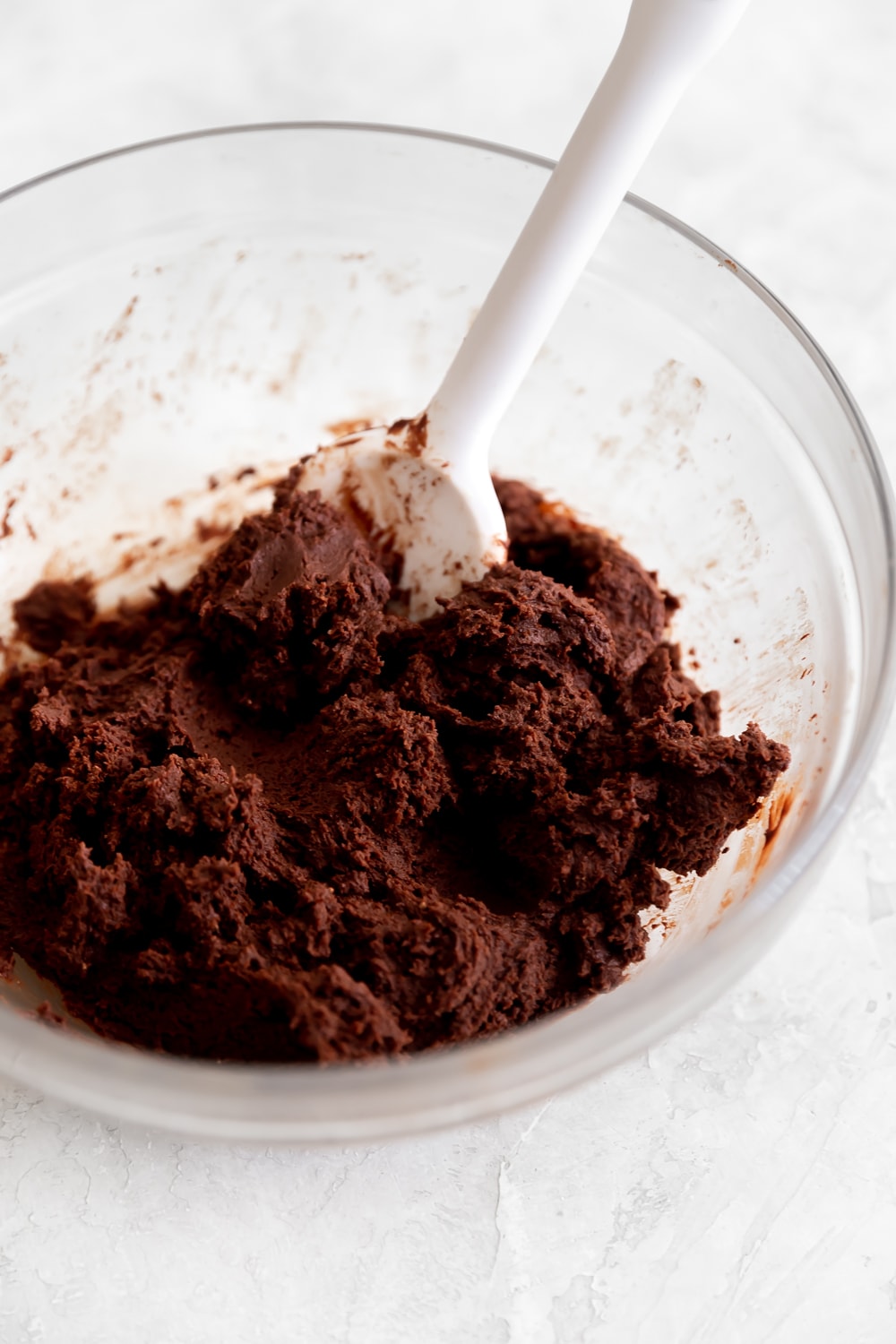 - Whisk in the flour, cocoa powder, baking soda, and salt until combined. The cookie dough will be sticky.