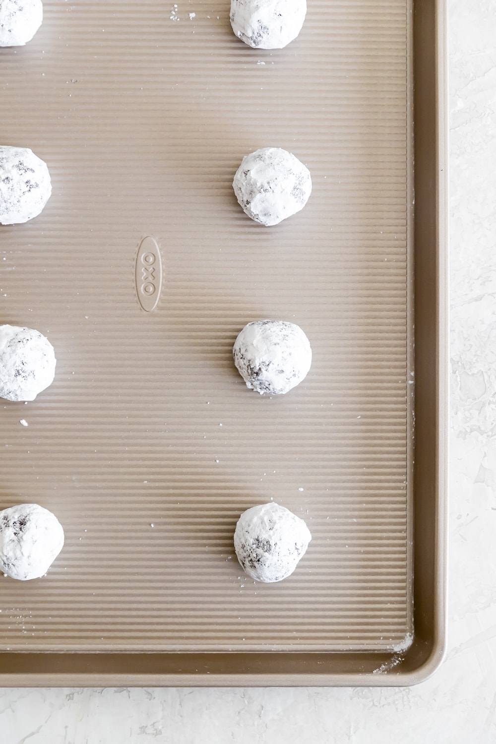 - Coat in the granulated sugar first then roll generously in the confectioner's sugar. The more powdered sugar, the better. Place the cookies on the baking sheet about 2 inches apart.
