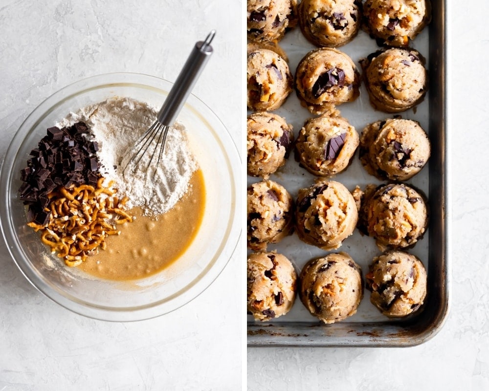 - Make the cookie dough batter. In a mixer or large bowl, cream the cooled brown butter and sugars together. Add the egg and vanilla extract. Mix until smooth and well combined. To the same bowl, add flour, baking soda, and salt. (Hooray for one-bowl cookie recipes!) Mix the wet and dry ingredients together until just combined. Do NOT over mix or you run the risk of having flat, pancake cookies. Fold in the chopped chocolate and crushed pretzels. Folding means using a spatula to mix it slowly until just combined.