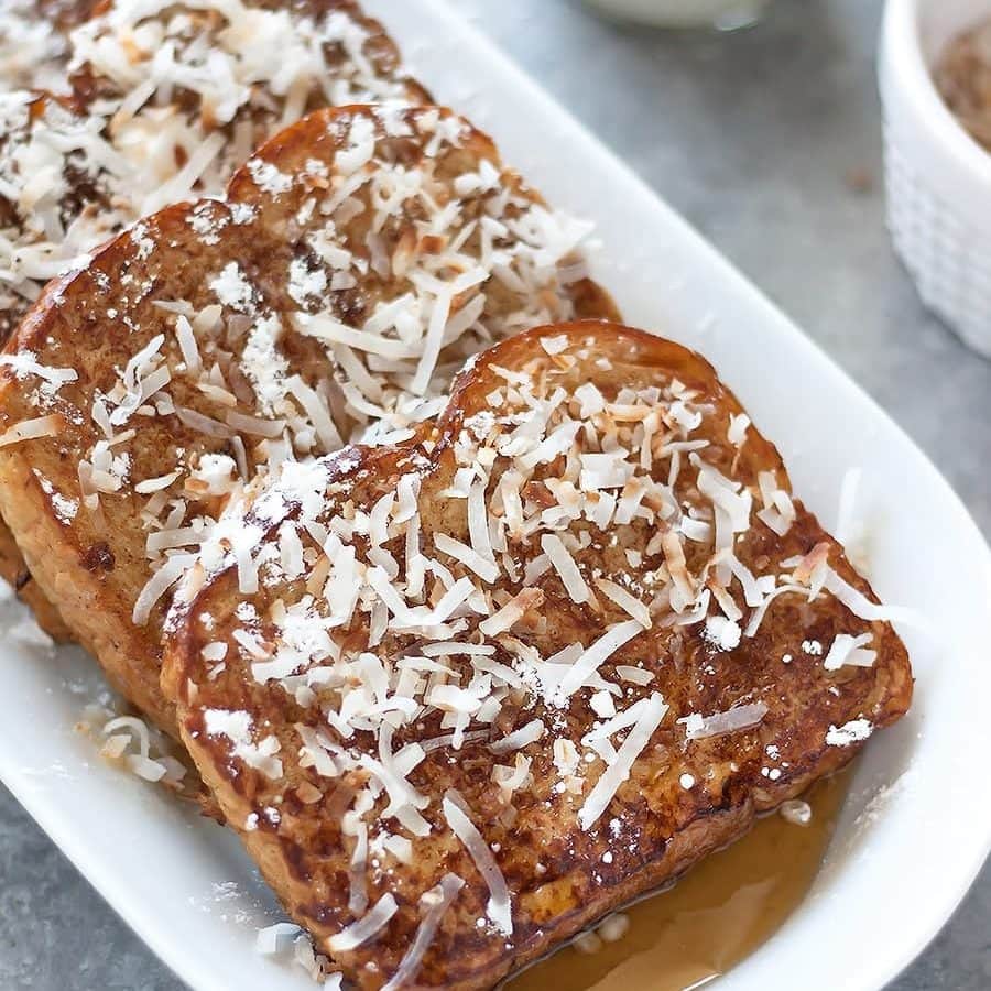 - Transfer to a plate and top the french toast with toasted coconut flakes, powdered sugar, cinnamon, and/or maple syrup. Serve immediately. Enjoy!