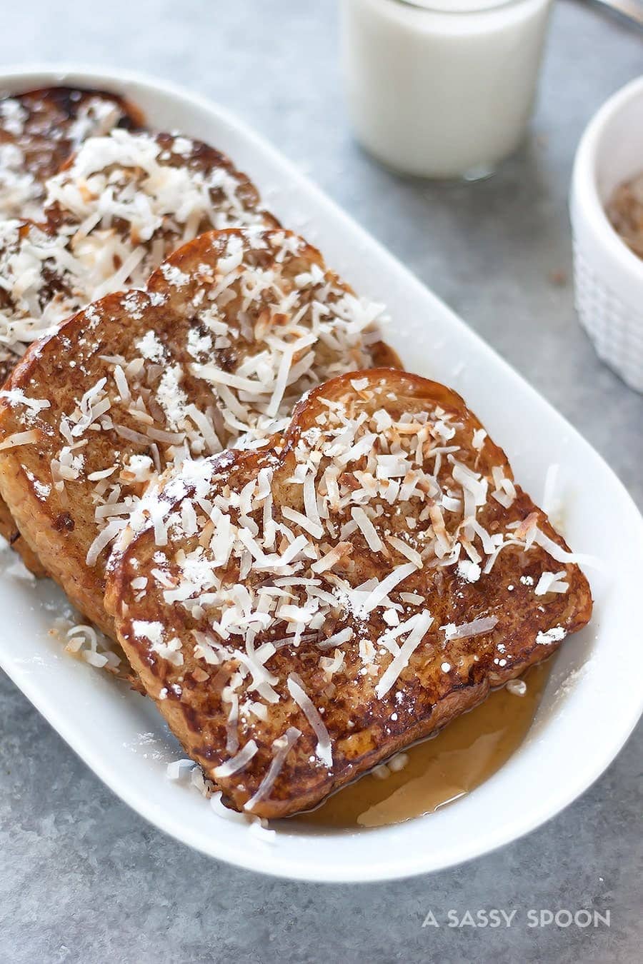 The best french toast recipe made with thick brioche bread, full-fat coconut milk, spiced rum, toasted coconut flakes, and then drizzled with pure maple syrup. Perfect for Sunday brunch!