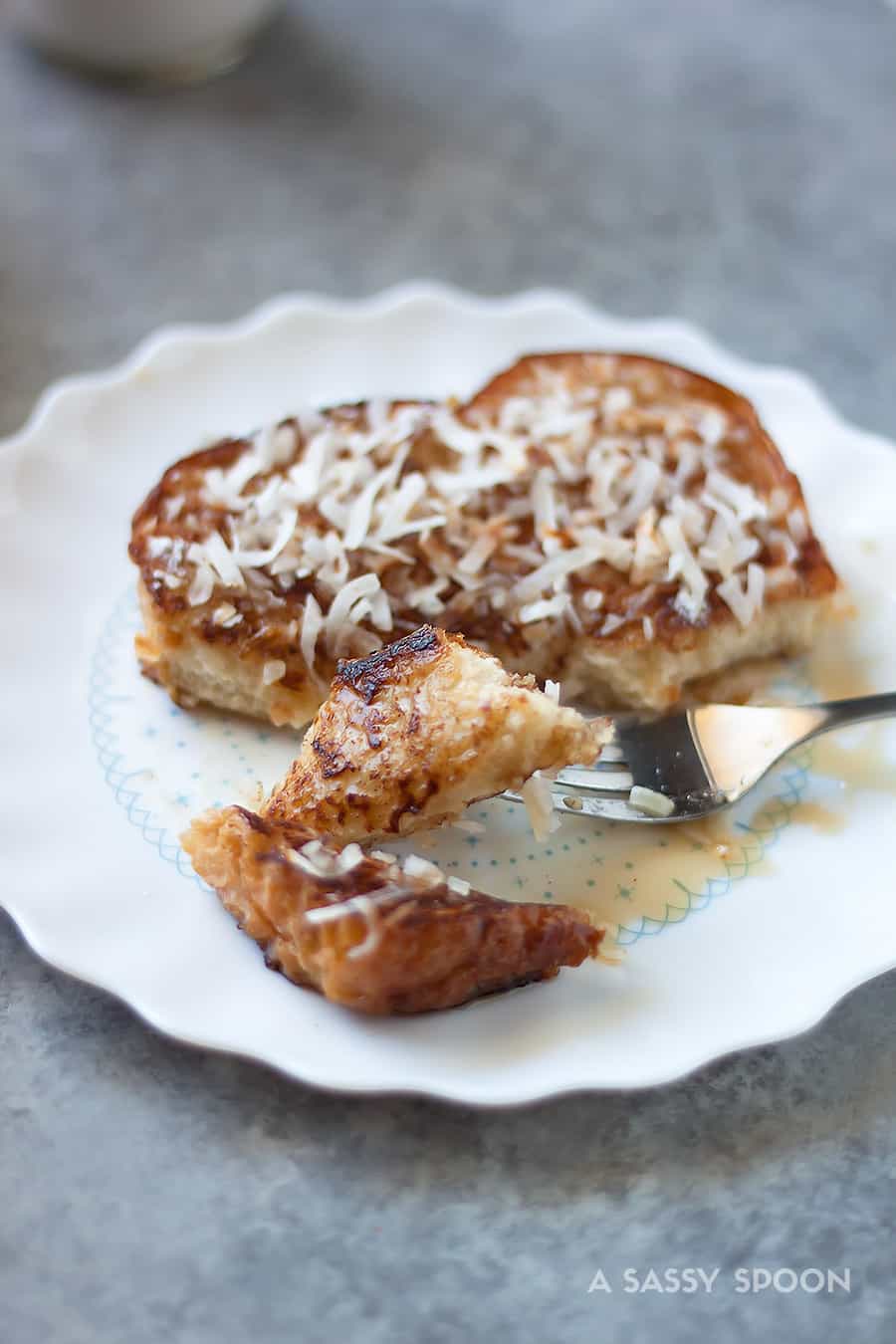 You guys, this easy french toast recipe was OUT OF THIS WORLD! The rich taste of coconut, the little hint of rum, and toasted coconut flakes on top. OH EM GEE AMAZING. Then again, I’m kind of wild about all things coconut. Mmmm.
