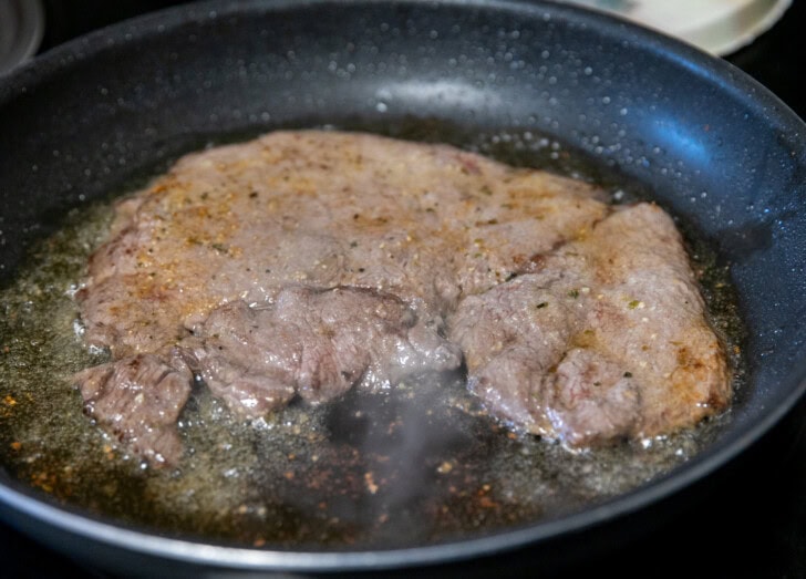 - In a large skillet, heat oil at medium-high heat. Remove steaks from the marinade, shaking off any excess, and place them on the pan. Cook them for 1-2 minutes per side until browned on both sides.