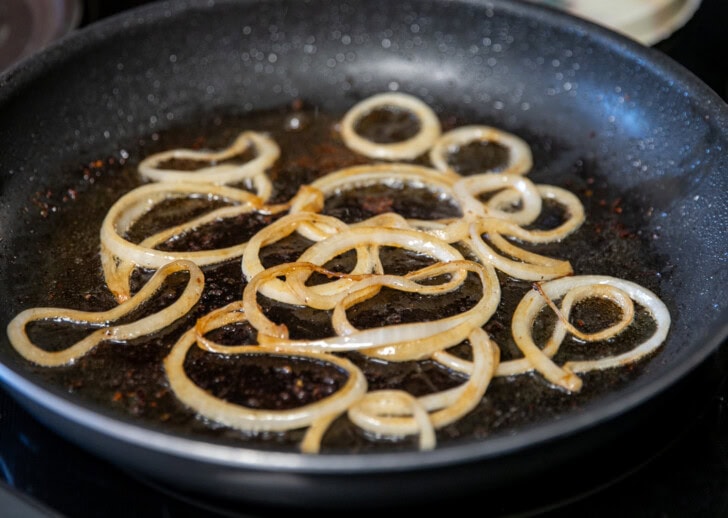 After 2 minutes, remove the steaks and cook the onions in the same pan. The smell alone will make your mouth water.