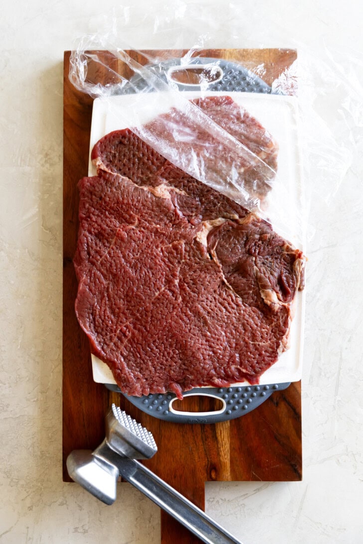 - If the steaks are already thin, you can skip this step. On a cutting board, place steaks between two pieces of plastic wrap. Using a meat mallet, pound the steaks until they're 1/4-inch thin.