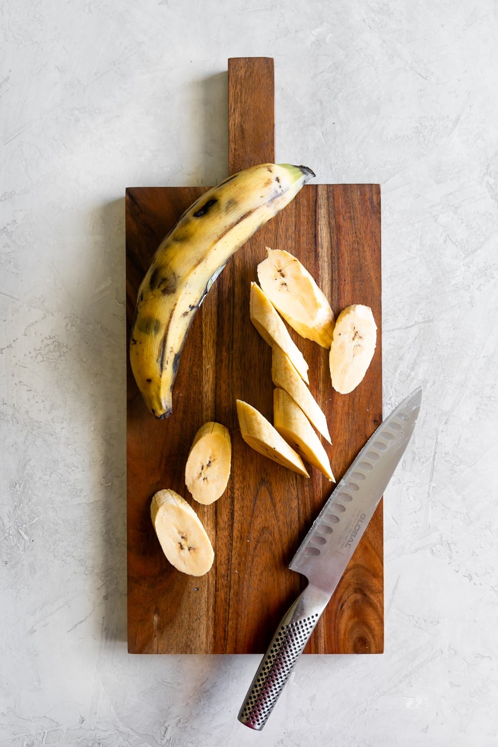 - Using a sharp knife, slice the plantains, diagonally, about 1/2-inch thick. Make sure they are all as close to the same size as possible so they cook evenly.