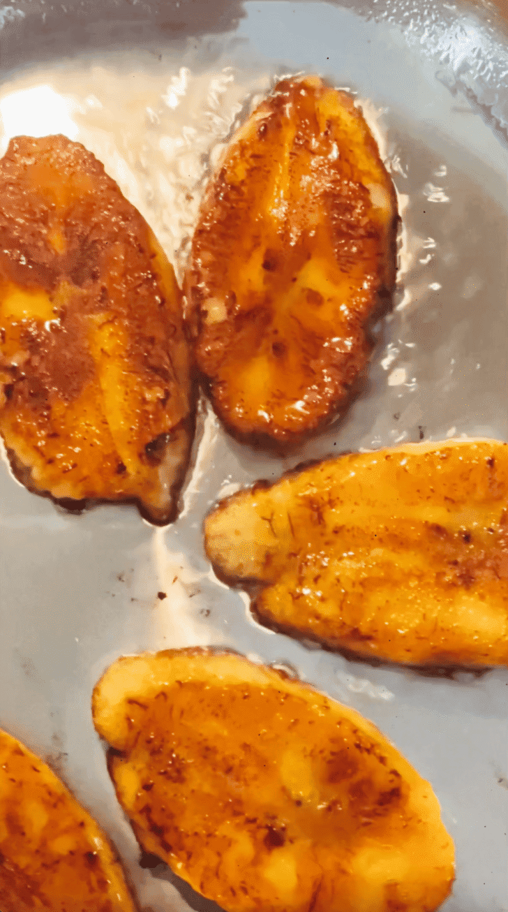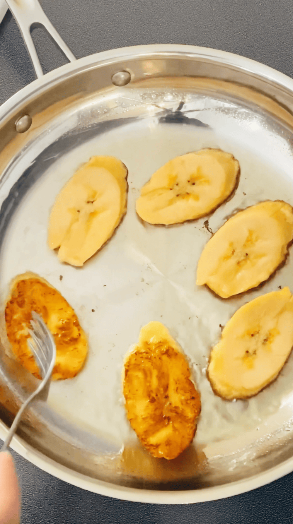 - Sweet Plantains are peeled and sliced diagonally, then fried in a bit of oil until golden brown and caramelized.