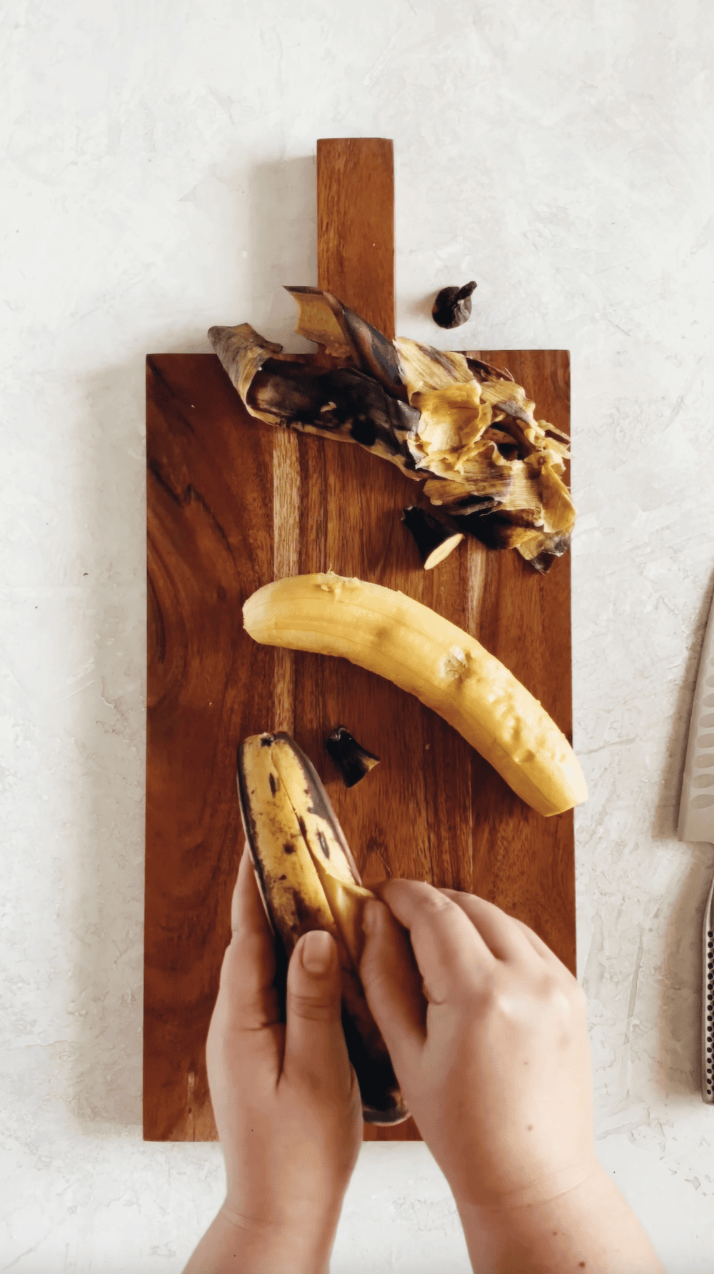 - Start by cutting the ends off the plantains with a sharp knife. Using the tip of the knife, make a shallow cut lengthwise along the plantain. Gently peel the skin off with your fingers. It should come off easily since they are soft (ripe).