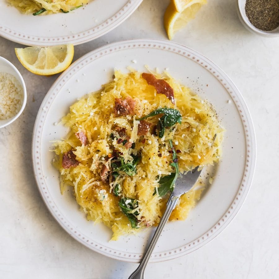Think super lemony, garlicky, cheesy, peppery pasta but instead of spaghetti, we’re using spaghetti squash. Can’t get any better than that!