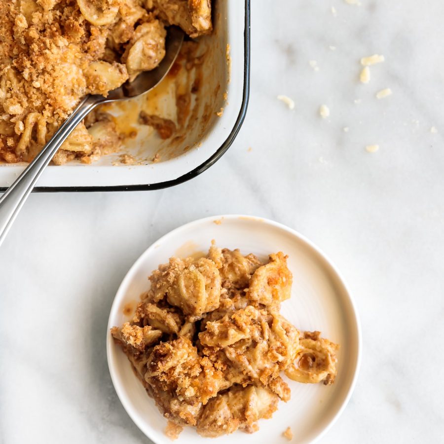 OH and can we talk about this cheesy, crunchy topping? I wanted to try out using crushed pork cracklings/rinds; the ones that come in a bag that you can find in the chip aisle, as a topping instead of the traditional bread crumbs. Best decision I made all day.