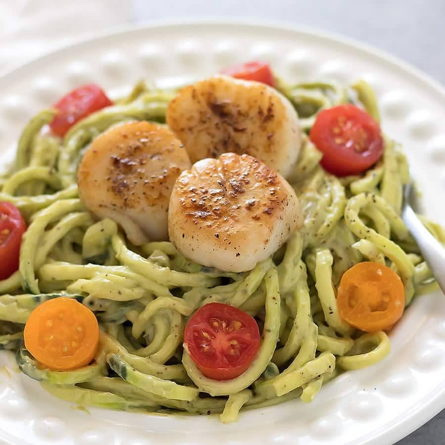 - Pour the avocado sauce over the zucchini noodles in the bowl and toss to coat. Divide the noodles between two plates, top each with three scallops, cherry tomatoes and enjoy!