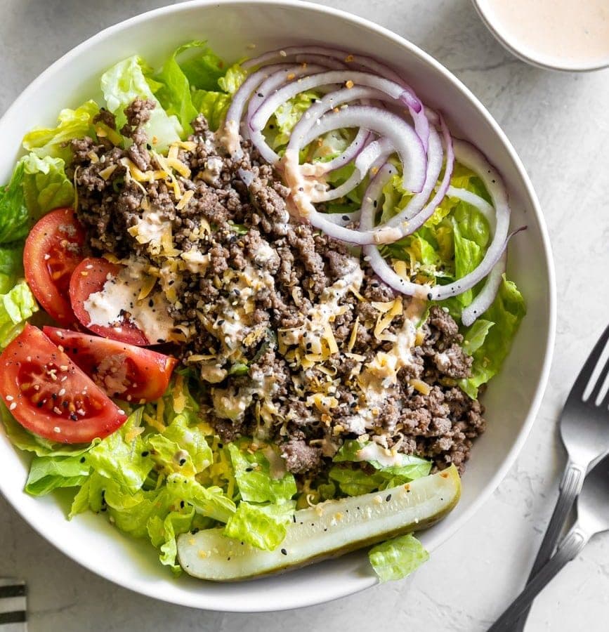 Imagine all the things you love about a burger – cheese, pickles, onions, lettuce, tomatoes, special sauce – all in a salad. Sign me up baby! After receiving my Butcher Box order, I had ground beef in my freezer that I wanted to use ASAP. Couldn’t think of a better recipe than a cheeseburger salad!
