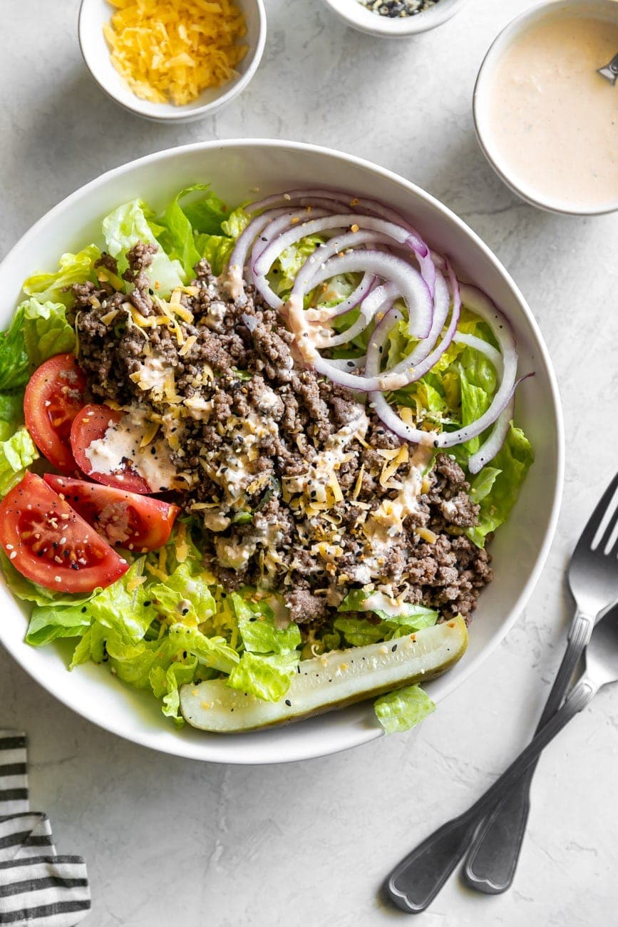 - Divide the romaine lettuce evenly among four bowls. Divide the beef mixture evenly. Add shredded cheese, tomatoes, pickles and onions. Drizzle with big mac sauce. Top with Everything Bagel Seasoning, if using. Serve and enjoy!
