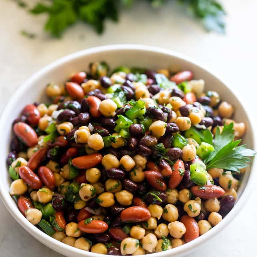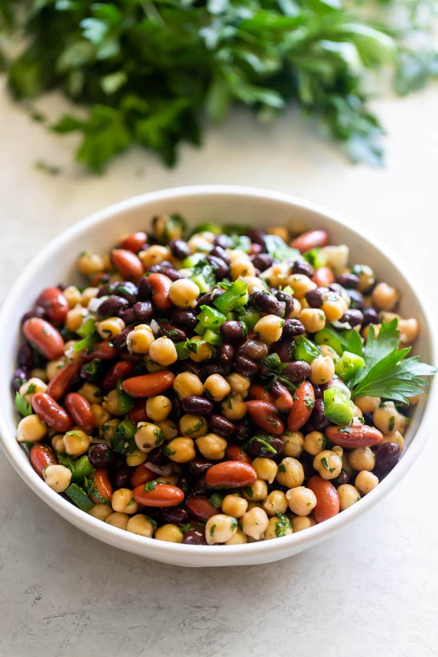 An easy-to-make three bean salad made with black beans, chickpeas, and kidney beans tossed in a delicious chimichurri vinaigrette.