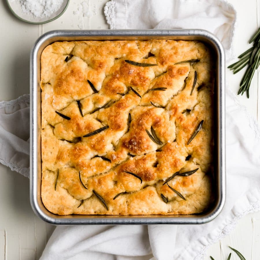 Focaccia is typically compared to pizza dough or flatbread however it’s not as dense as you would expect, especially if you measure the ingredients correctly, don’t overwork the dough, and bake it in an 8×8 baking dish. I find it to be more soft and chewy with a crisp top.