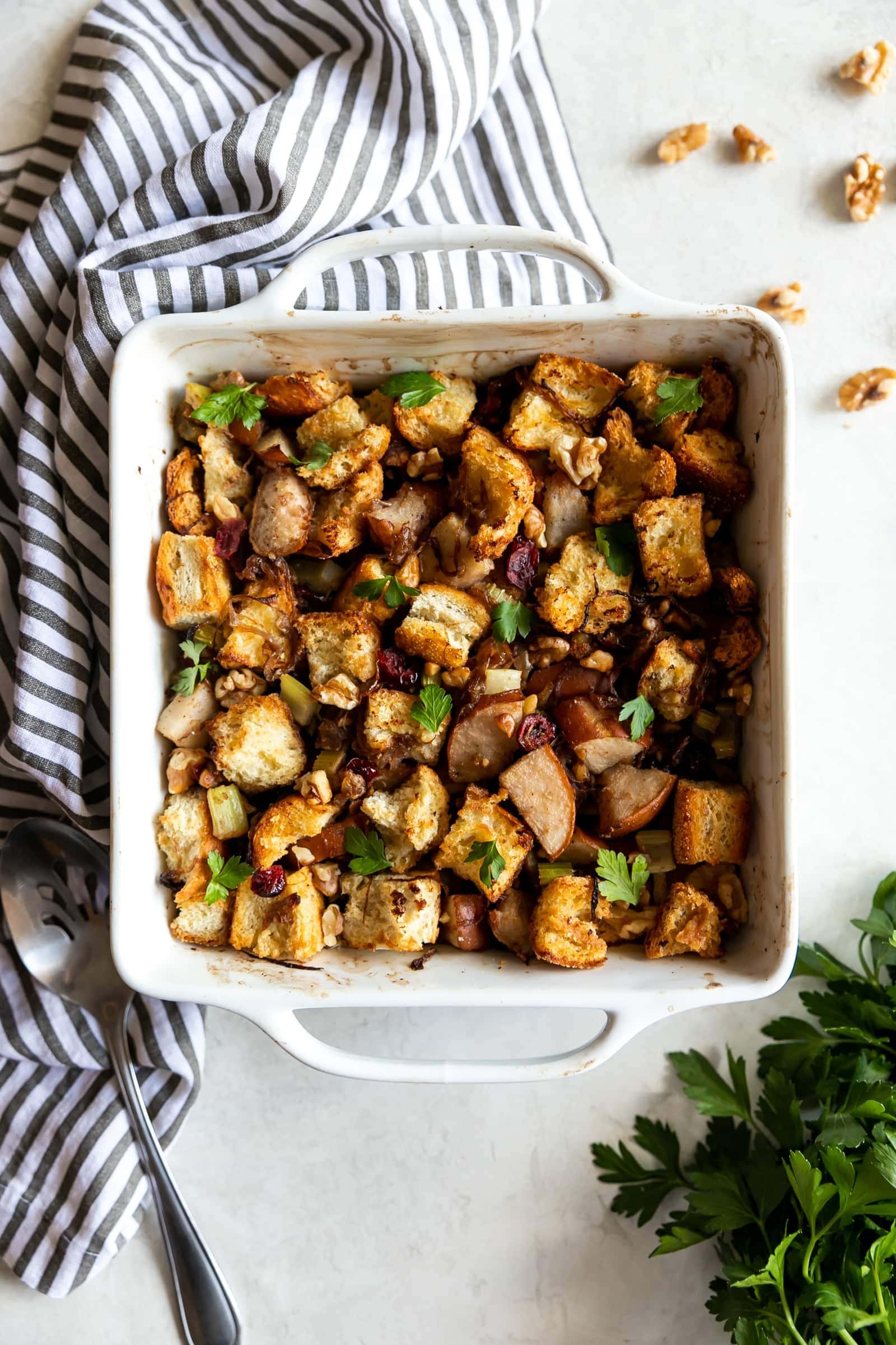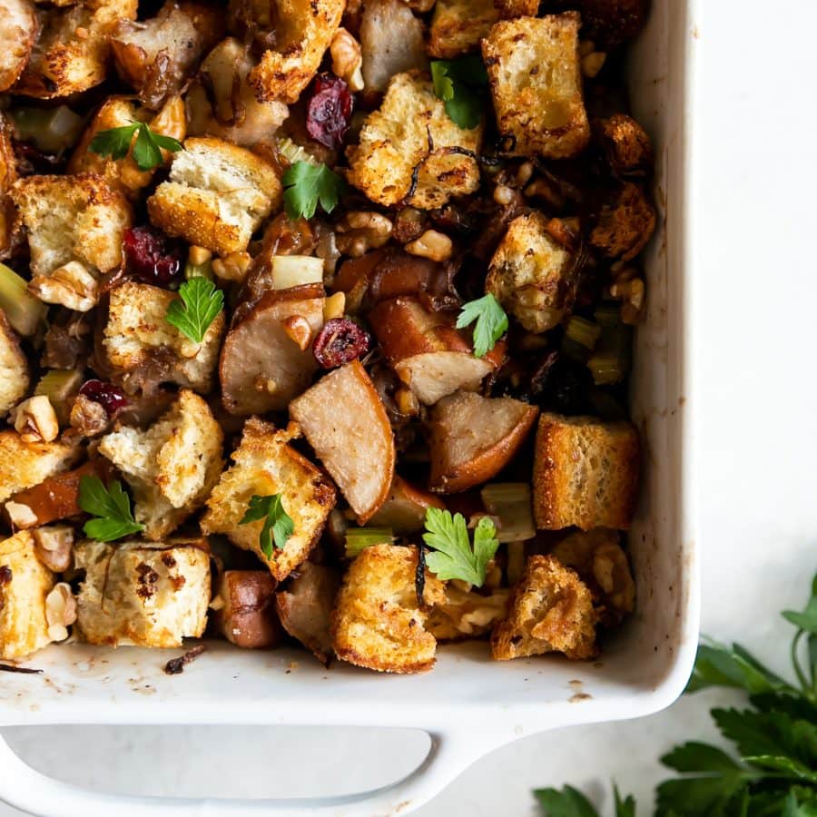 Caramelized Onion Pear & Walnut Stuffing. A flavorful and easy-to-make Thanksgiving stuffing made with caramelized onions, pears, celery, walnuts, and dried cranberries.