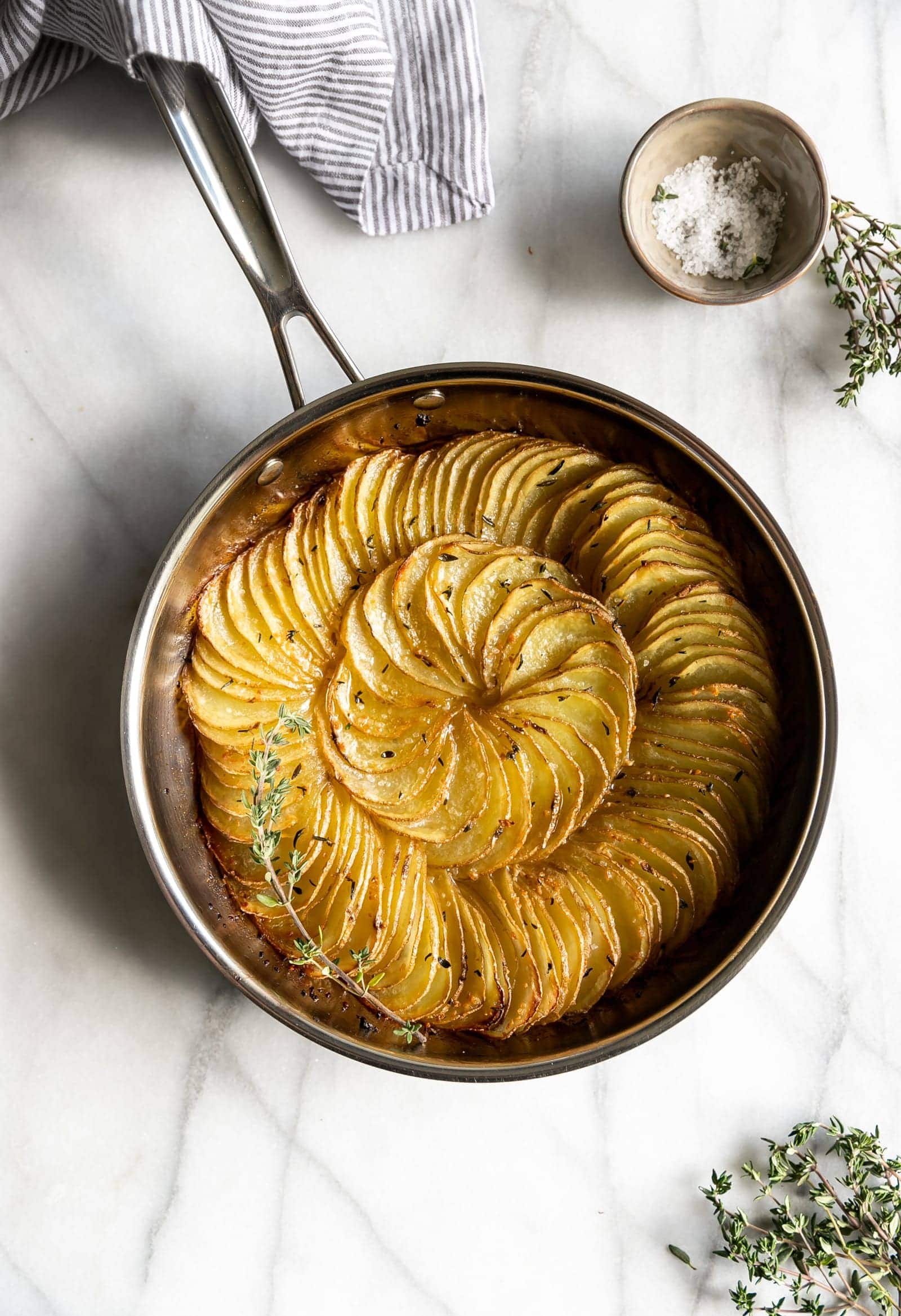 - Place the sliced potatoes in a pan. Preheat oven to 375 degrees F. Coat the bottom of a cast-iron pan or large skillet with 2 tablespoons of melted butter. Set aside. Arrange the potato slices vertically at an angle in the pan, filling the pan completely without crowding it. Make sure there’s space in between each slice so it cooks evenly.