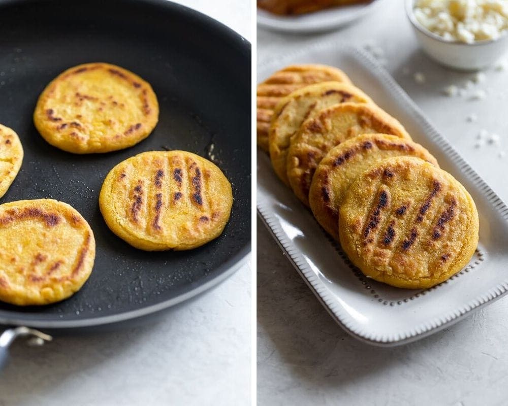 Make sure the arepas cook for 5 minutes, undisturbed, on each side. The outside should be golden brown while the inside is slightly doughy. This is what you want. If you cook them for longer than 10 minutes total, you may run the risk of them being dry. Use your best judgment here.