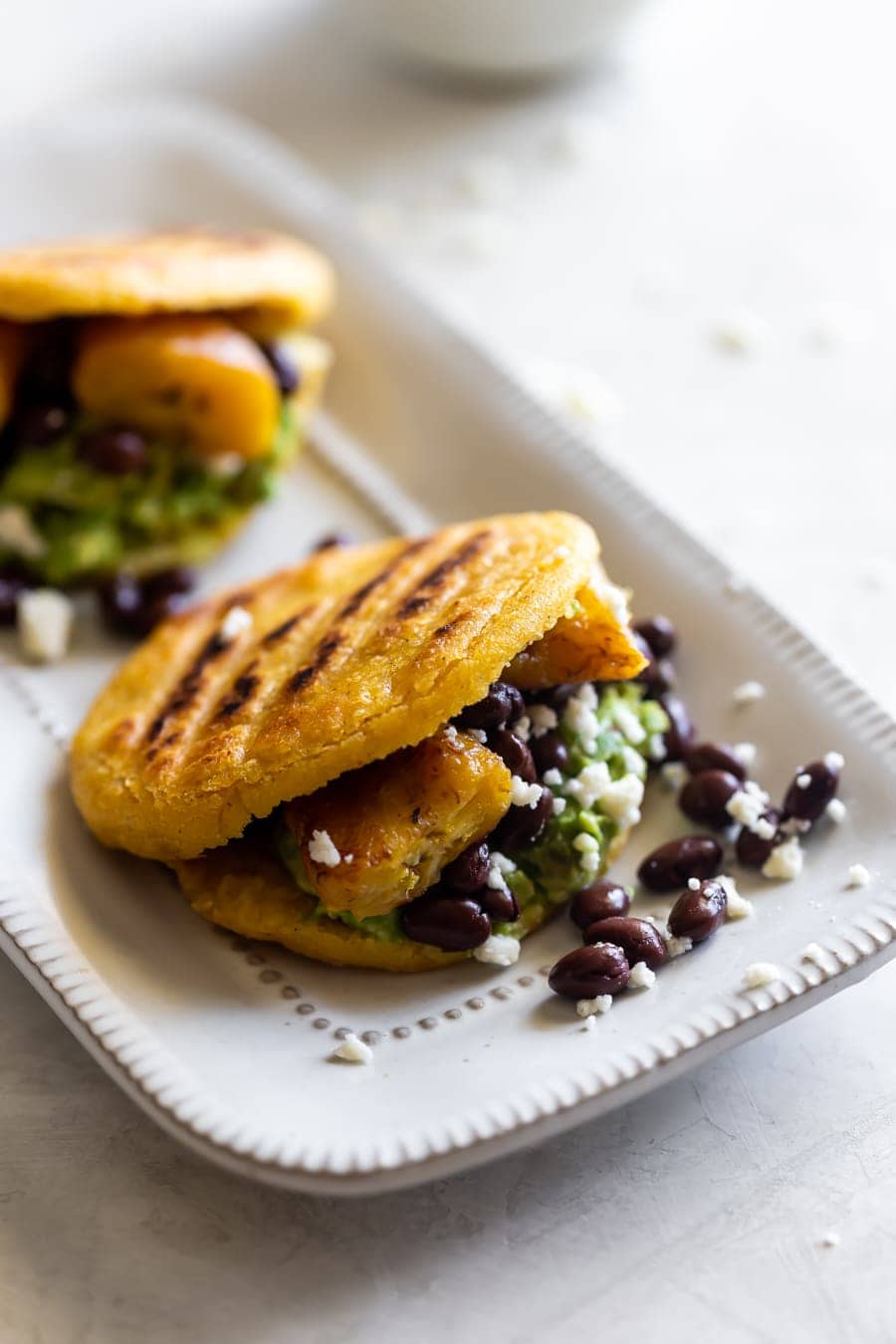 Easy-to-make arepas (pan-fried golden corn cakes) made with black beans, sweet plantains, and mashed avocado. Perfect for any day of the week!