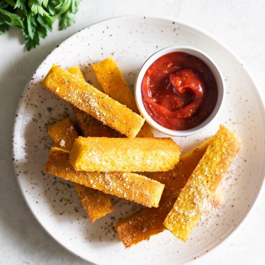 I don’t think you’re ready for today’s delicious recipe. After trying polenta fries in a local pizza shop, I was SOLD! Picture rectangular logs that taste like sweet, savory corn, crispy on the outside and creamy on the inside. They were so DELICIOUS, that I knew I had to bring them to the blog.