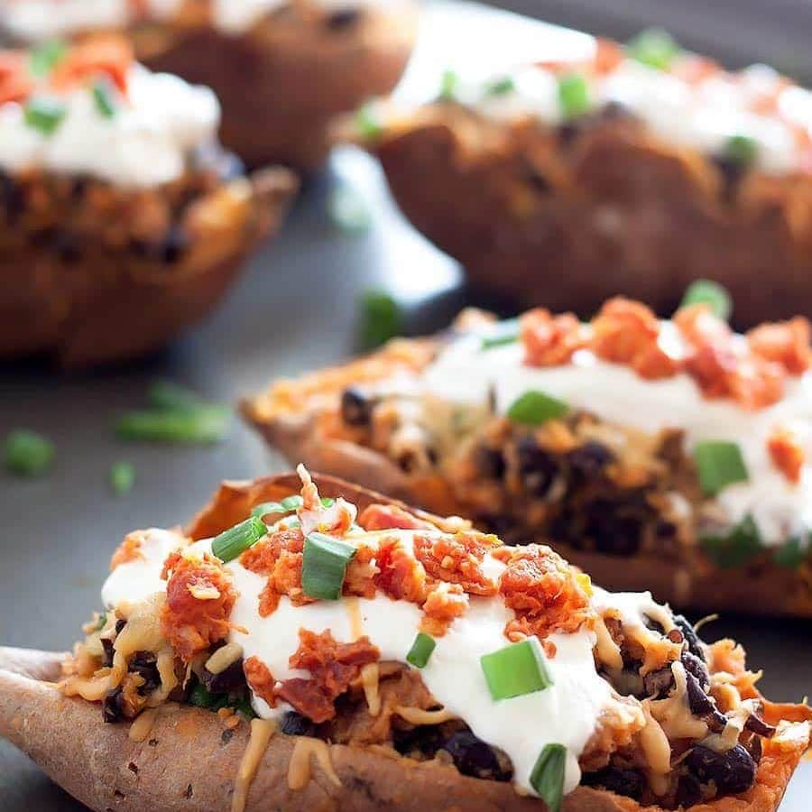 Crispy sweet potato skins loaded with gouda, chorizo, black beans, sour cream, and scallions! Perfect for a weeknight meal, side dish, or game day!