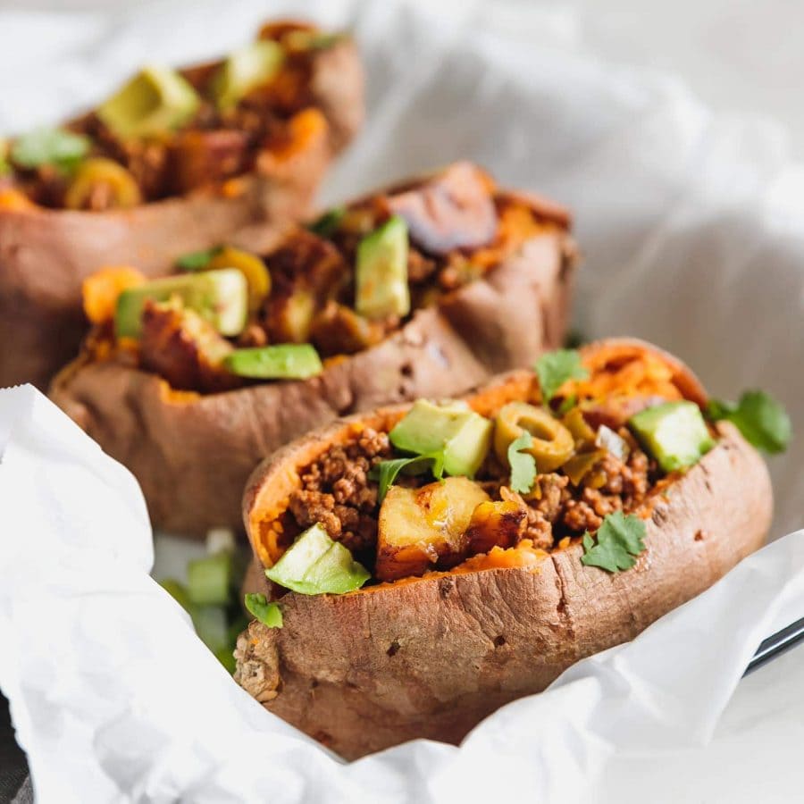 Why are sweet potatoes so versatile? One minute you’re making bacon wrapped sweet potato fries and the next minute gouda-chorizo loaded sweet potato skins.
