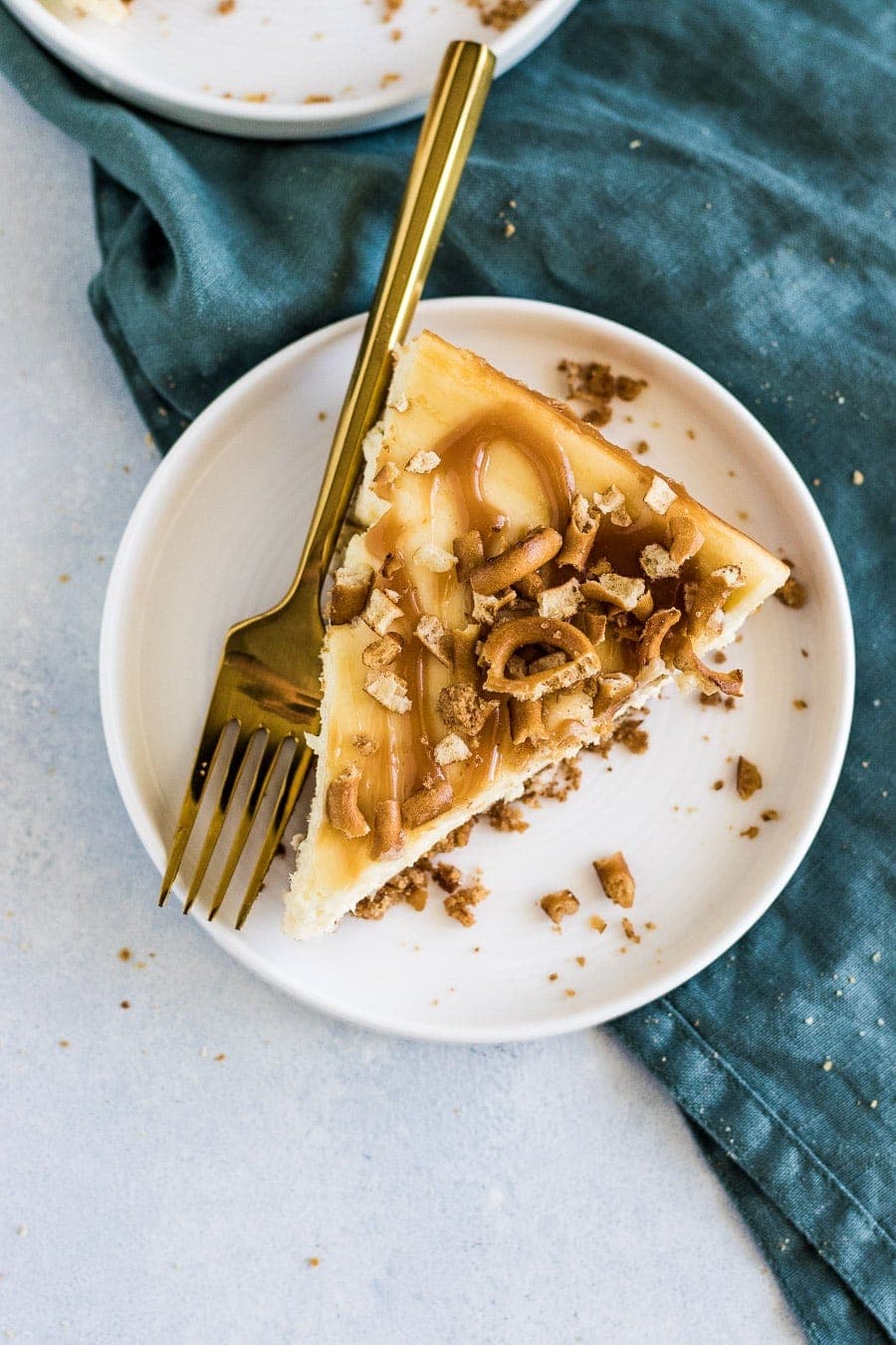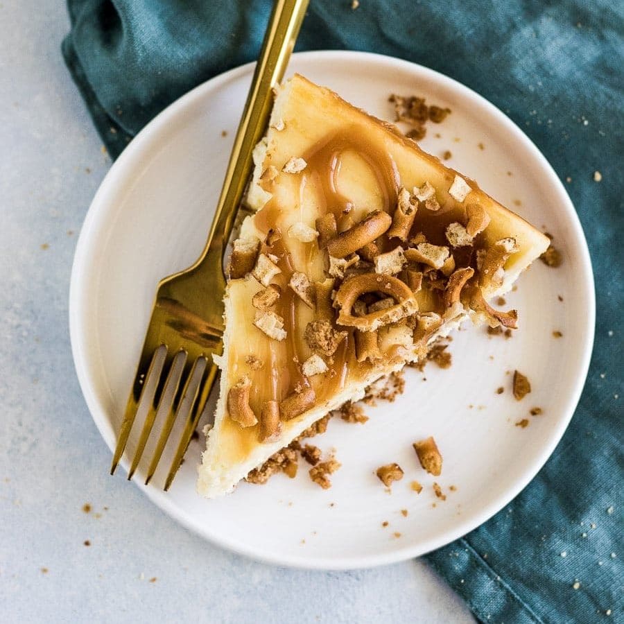 This Small Batch Salted Caramel Pretzel Cheesecake is made in a loaf pan and makes 5 slices.