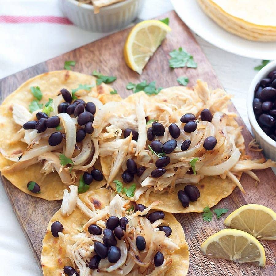 - Assemble the tacos by adding the shredded chicken with onions first, then top with black beans (and additional toppings, if desired). Serve with lime wedges.