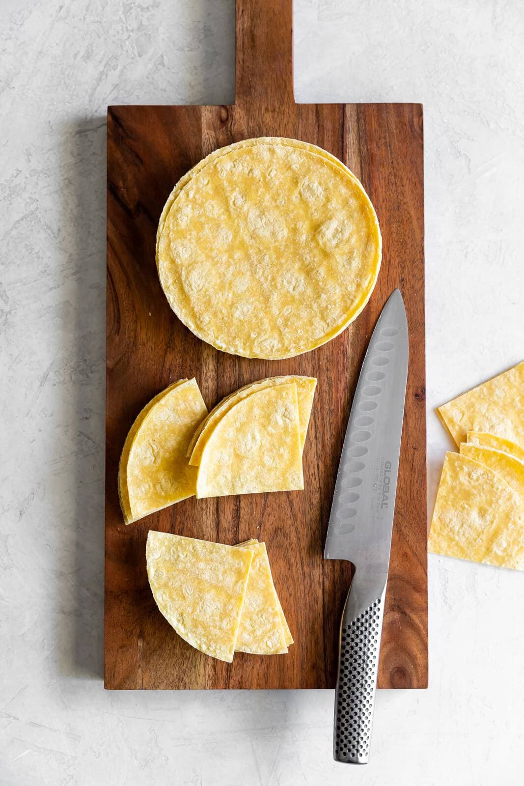 Here’s what I do to maximize my time and space with these tortilla chips. Brush each tortilla with olive oil. Pile them up. Let’s say you stack 5 tortillas one on top of the other. You cut through the entire 5 tortillas with a sharp knife to make 4 triangles for each tortilla.