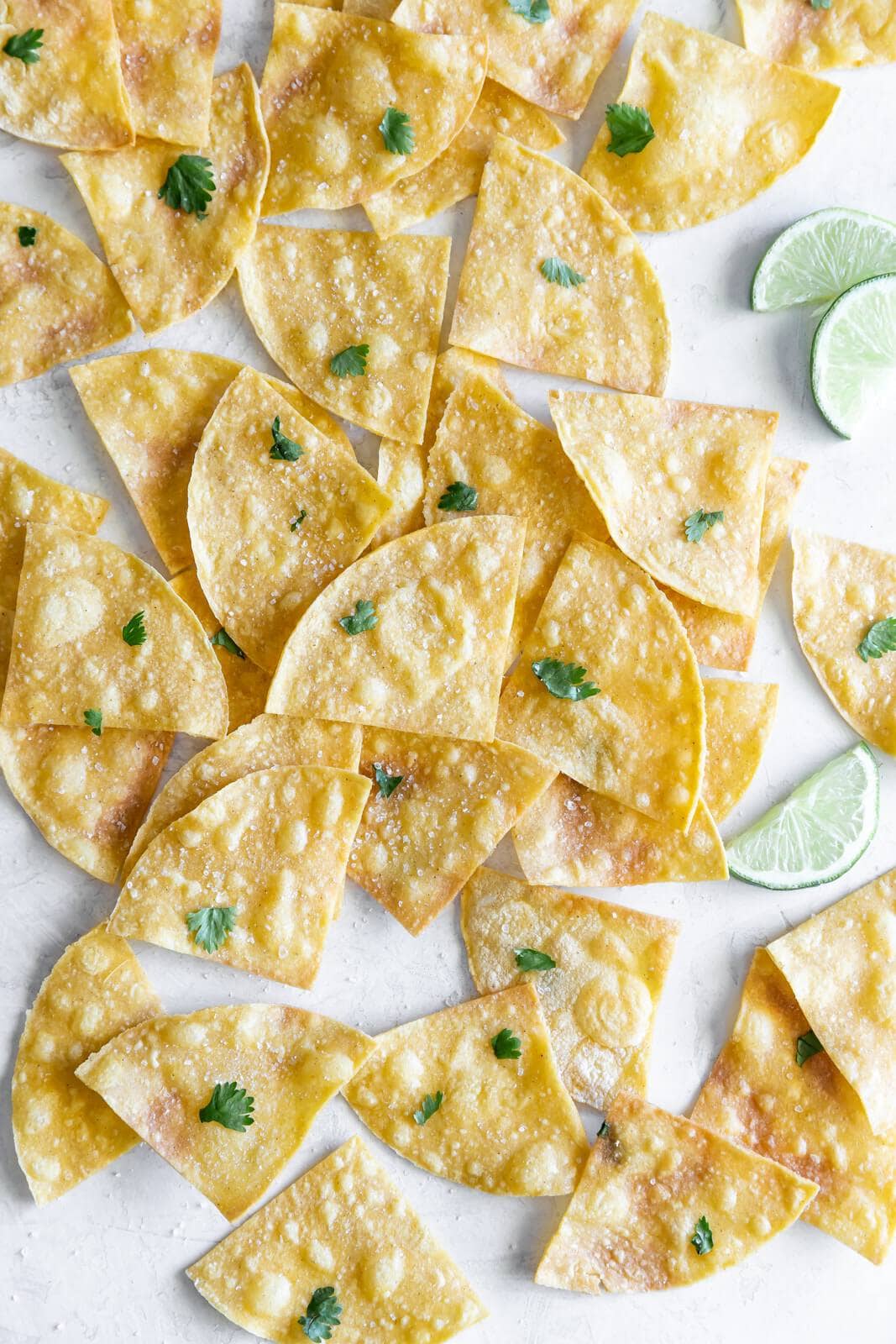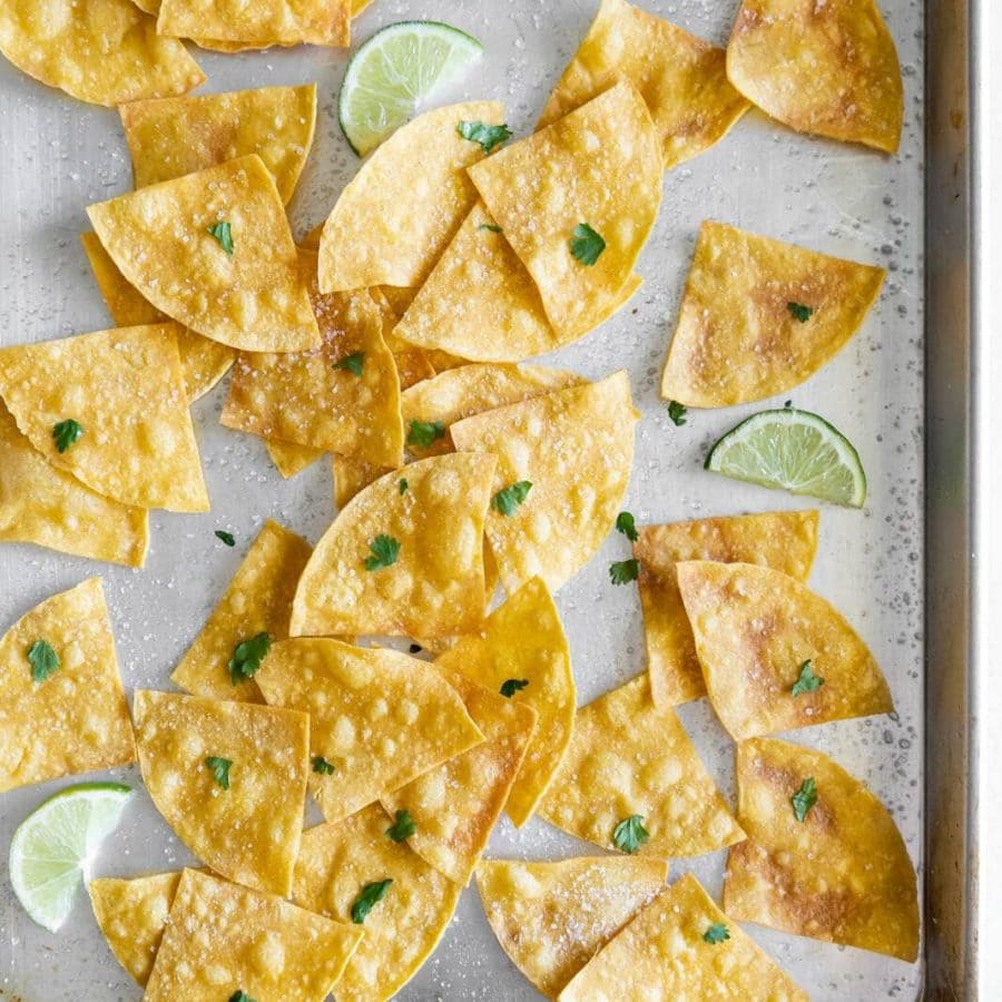 Salty, crunchy homemade baked tortilla chips with just 3 ingredients! Quick and easy-to-make, you’ll never buy store-bought chips again. Also, a great way to use leftover corn tortillas!