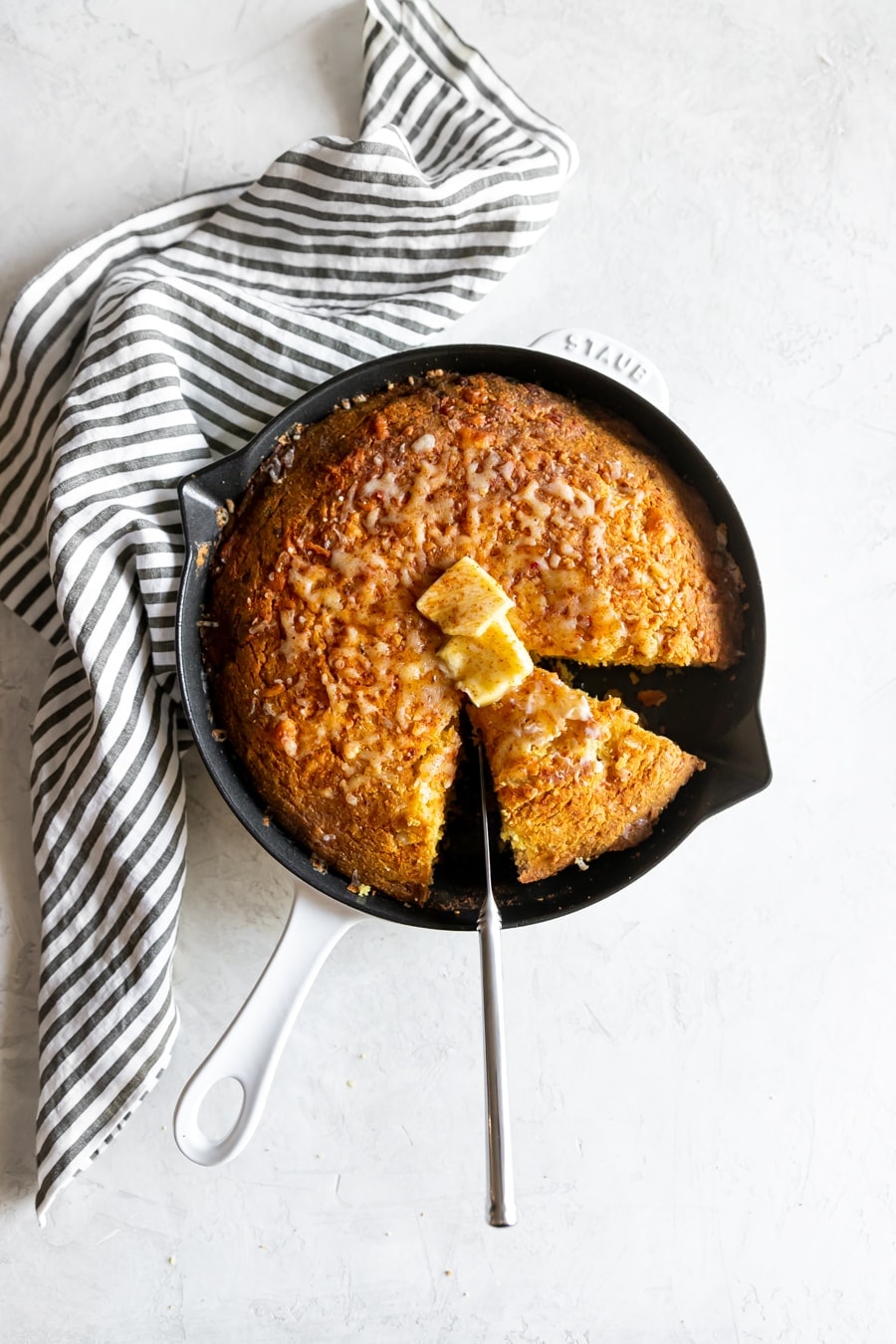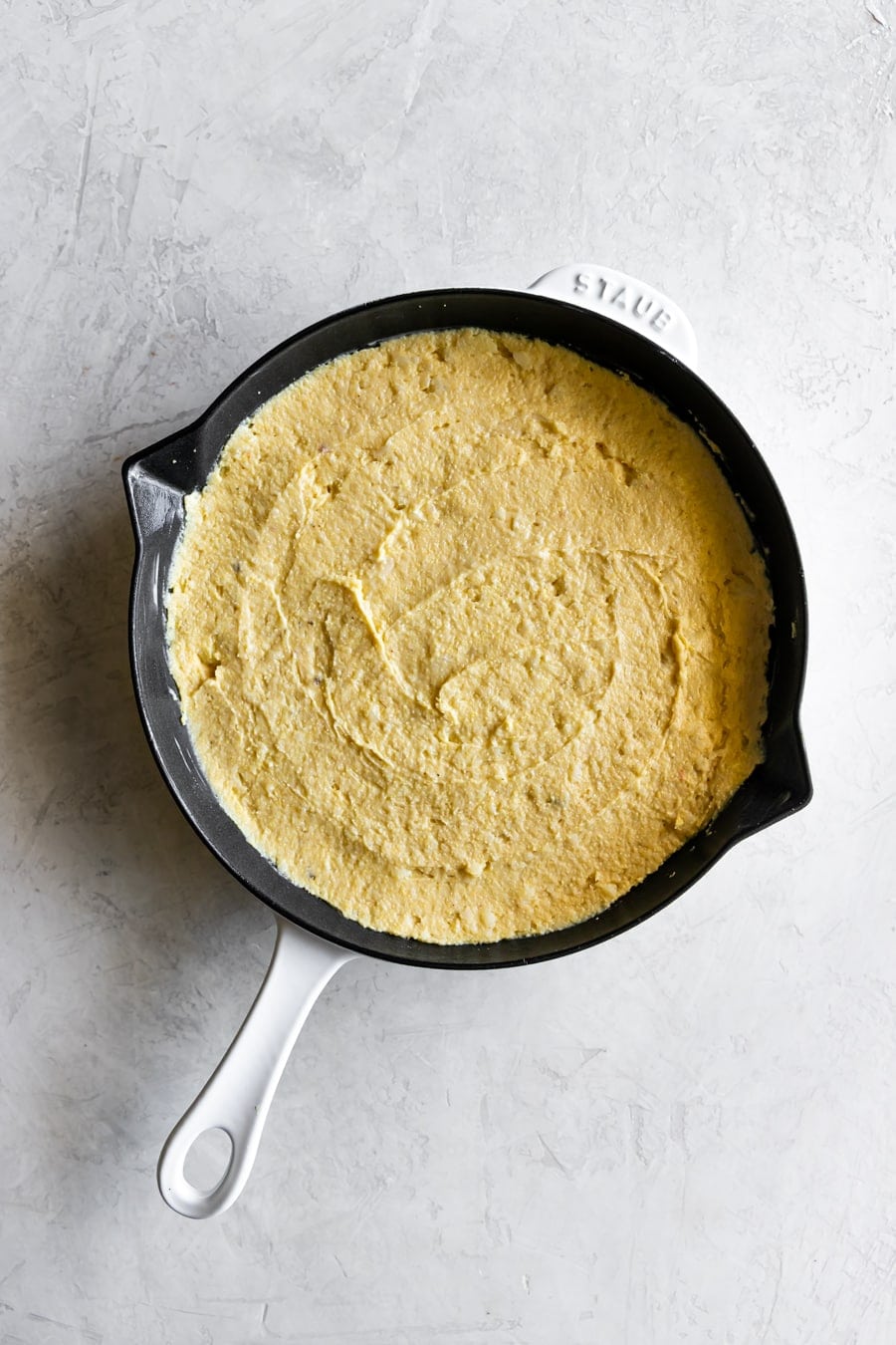 Transfer the cornbread batter into the cast iron pan coated in melted butter or nonstick spray before transferring the batter. Sprinkle the rest of the shredded cheese on top. Bake for 25-30 minutes until a toothpick is inserted and comes out clean.