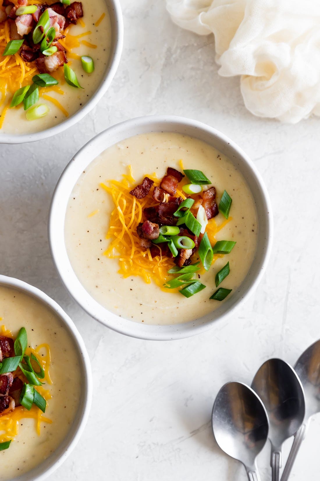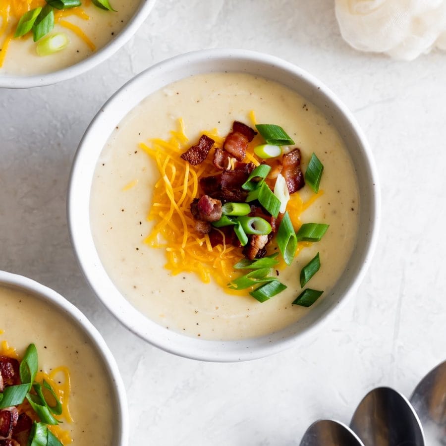 - Serve and top the soup with bacon pieces, shredded cheddar cheese, and green onions. Enjoy!