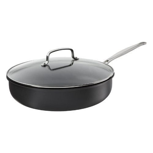 This large, hard anodized, nonstick pan makes frying easy and makes cleanup a breeze. Highly recommend!
