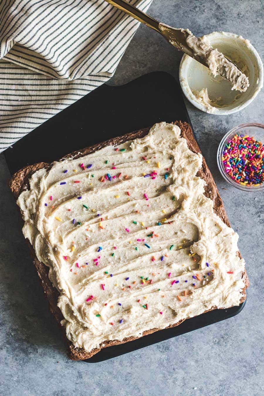 - Once the brownies have cooled, pour the frosting over the top and spread it evenly. Add sprinkles too, if desired. Serve and enjoy!