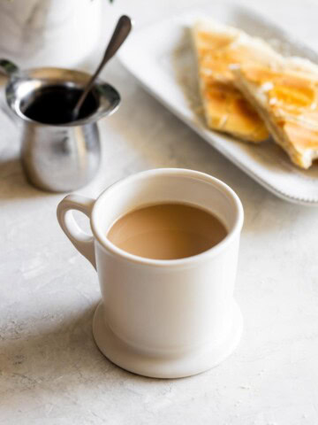 Cafe con leche is a morning beverage made with strong Cuban espresso, whole milk, and sugar usually served with buttered Cuban toast.