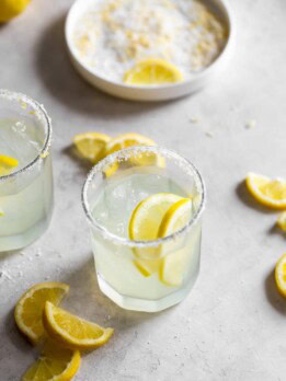 In a plate, combine lemon zest with kosher salt. Run a lemon wedge around the rim of the glasses and dip them in lemon salt to coat.