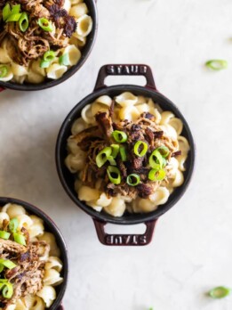Serve mac and cheese topped with vaca frita. Garnish with green onions. Enjoy!