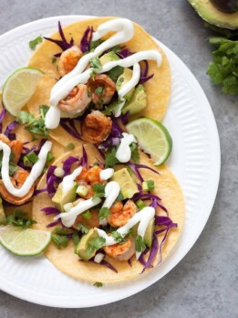 - Divide red cabbage, shrimp, avocado, evenly among the warm tortillas. Drizzle with sour cream and top with scallions. Serve immediately. Enjoy!